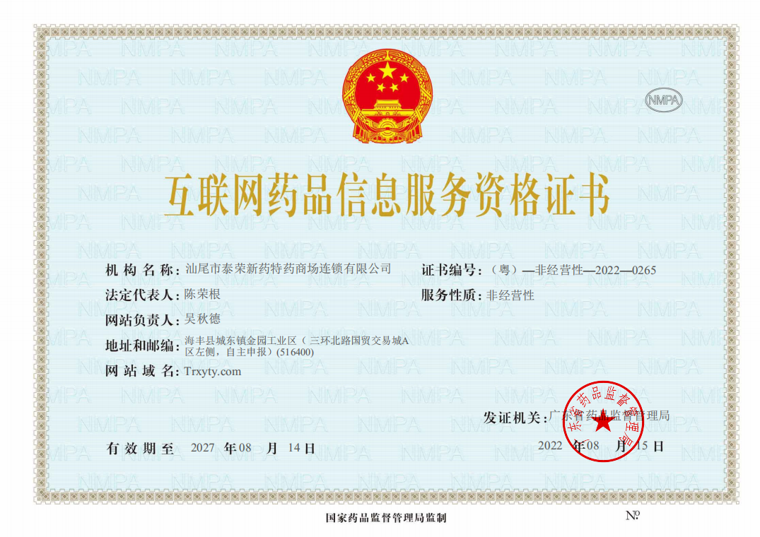 互聯(lián)網(wǎng)藥品信息服務(wù)資格證書 :(粵)一非經(jīng)營性一2022一0265